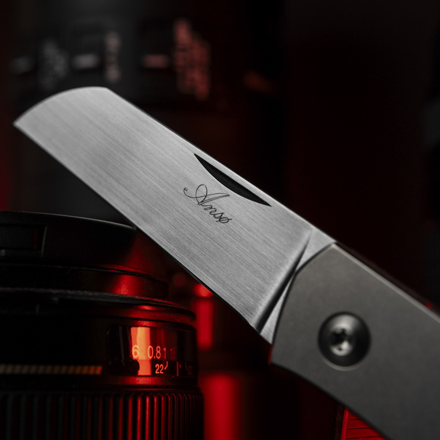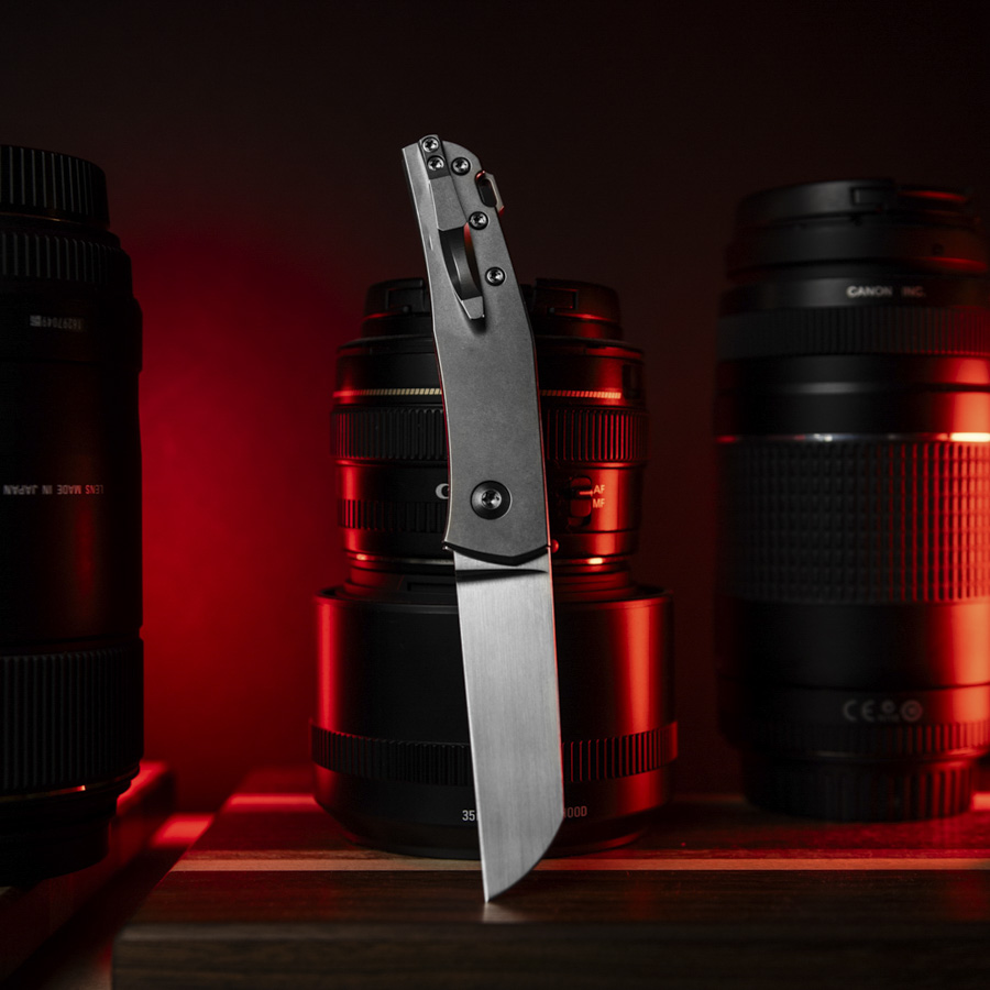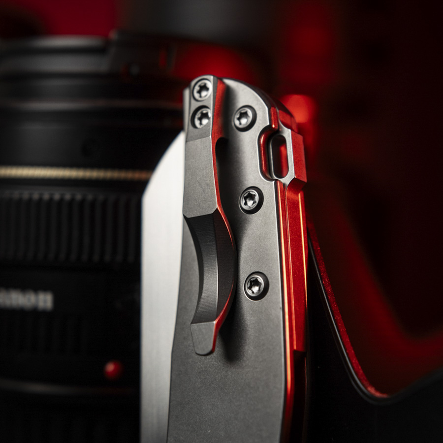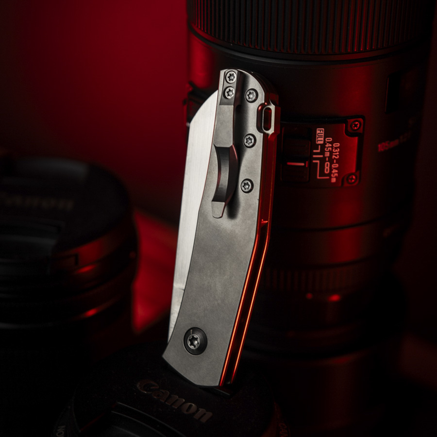Die unglaublich klare Line und die damit Hand in Hand gehende Materialwahl, lassen das Monte Carlo gleichermaßen dezent wie edel und sportlich wie entspannt erscheinen. Beim Griff handelt es sich um eine offene Titan-Konstruktion, welche auf der Rückseite von einem farbig anodisierten Titanbackspacer verbunden wird (bei dieser Version grau in grau). Durch die offene Bauweise kannst du das Messer sehr einfach nach der Benutzung reinigen, wenn beispielsweise Schmutz auf der Innenseite sitzt.