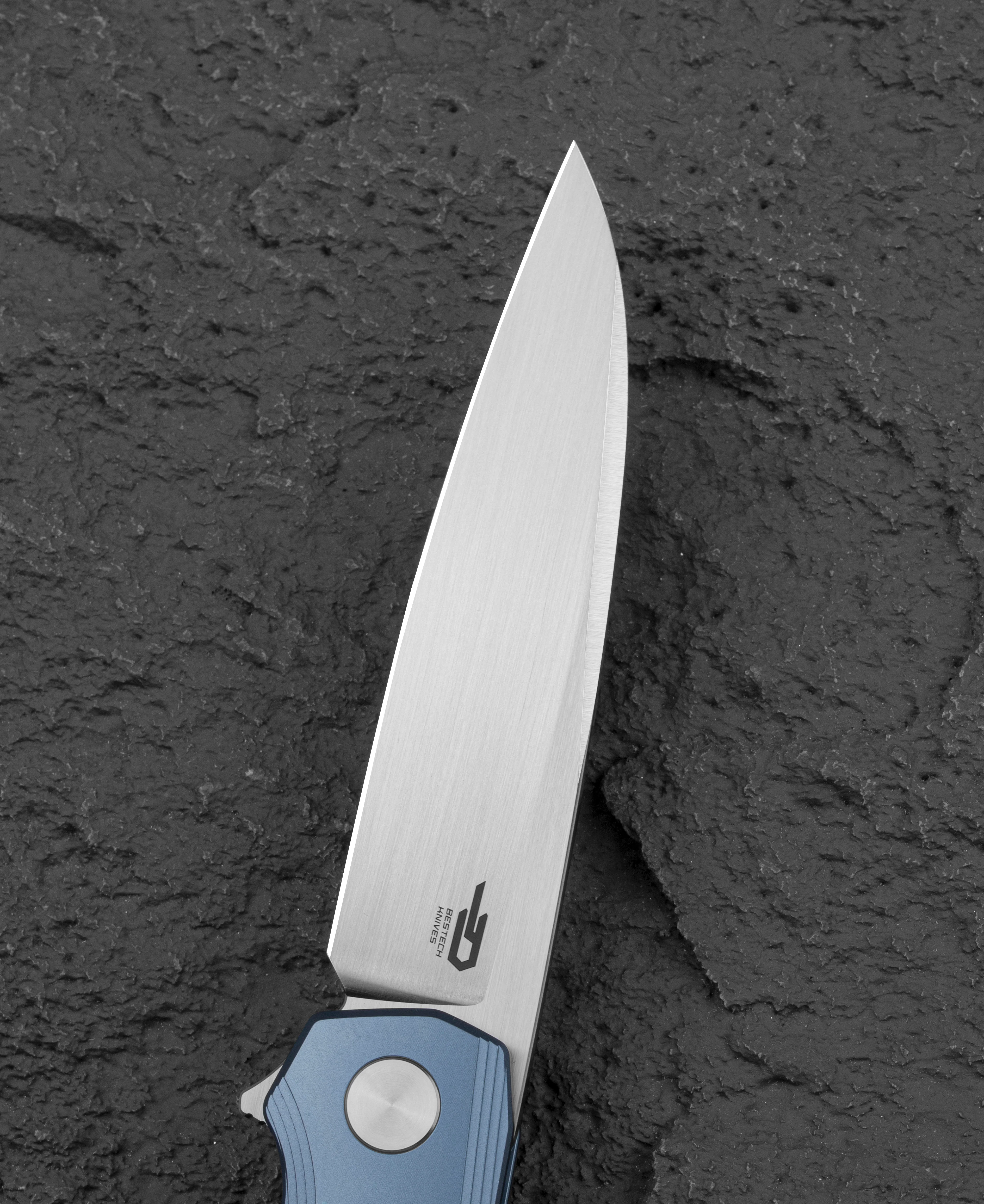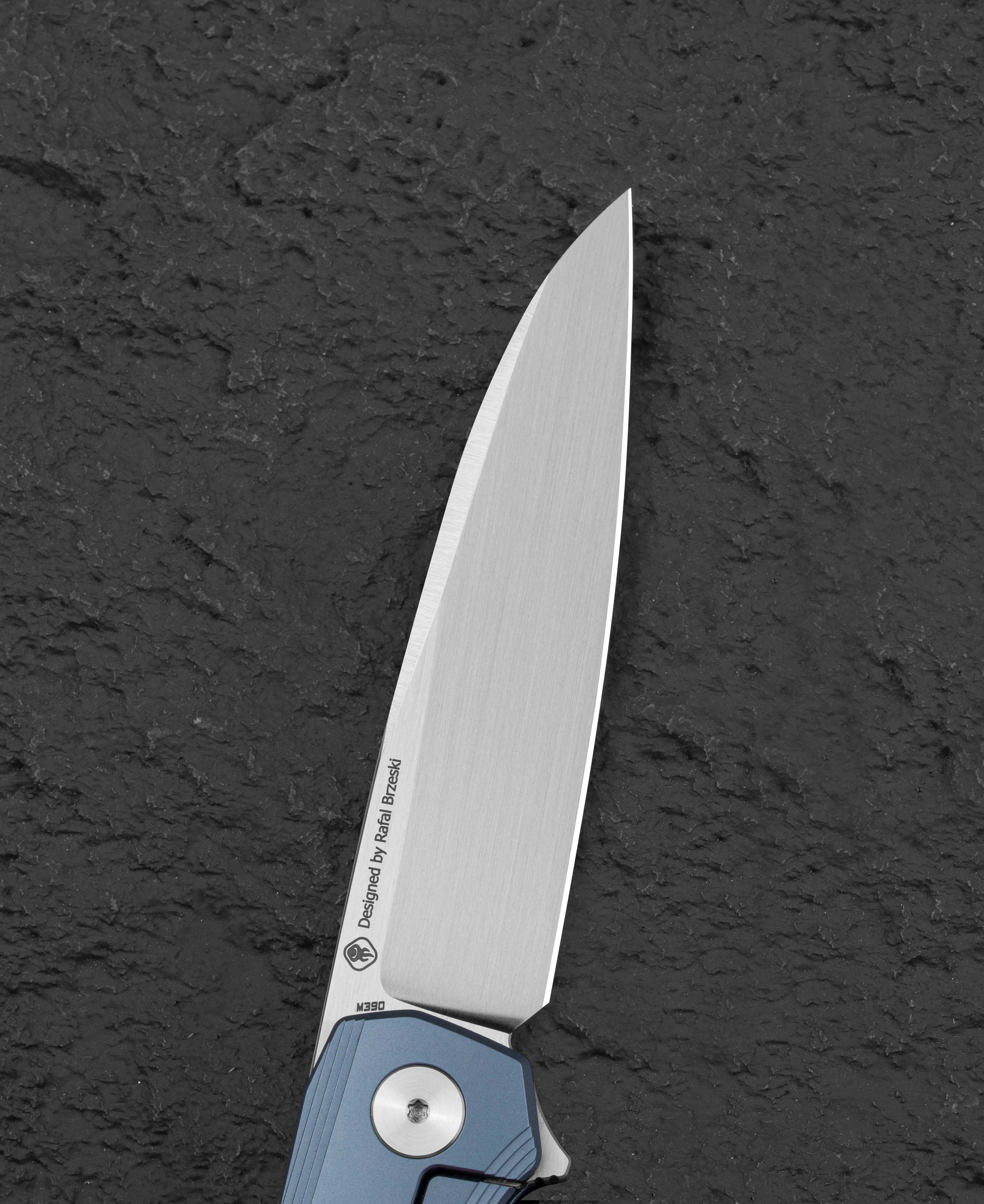 Die Klinge aus satiniertem M390-Stahl weist eine kurvige Sheepfoot-Form auf, die den Schwung des Griffs gekonnt aufnimmt.