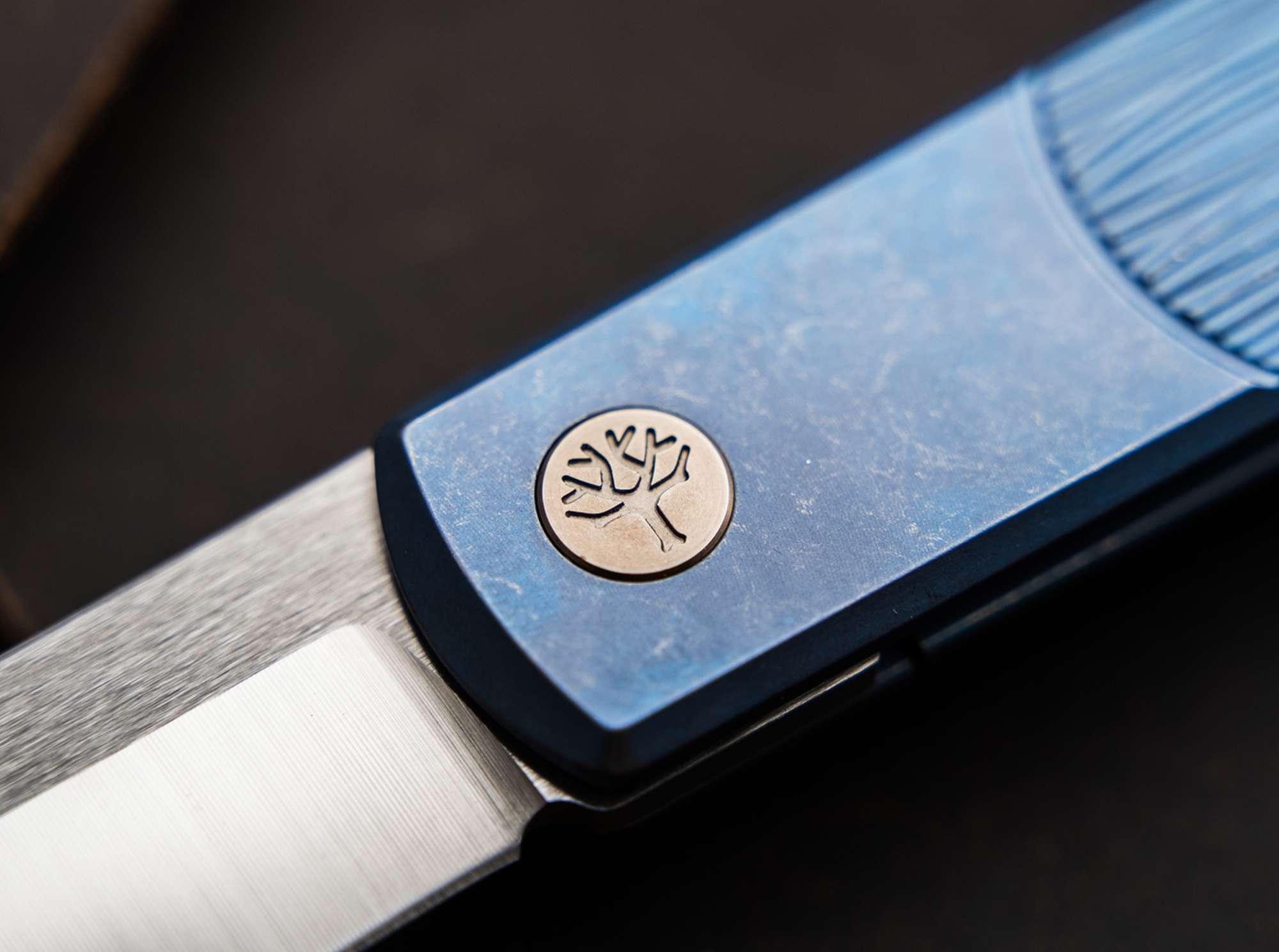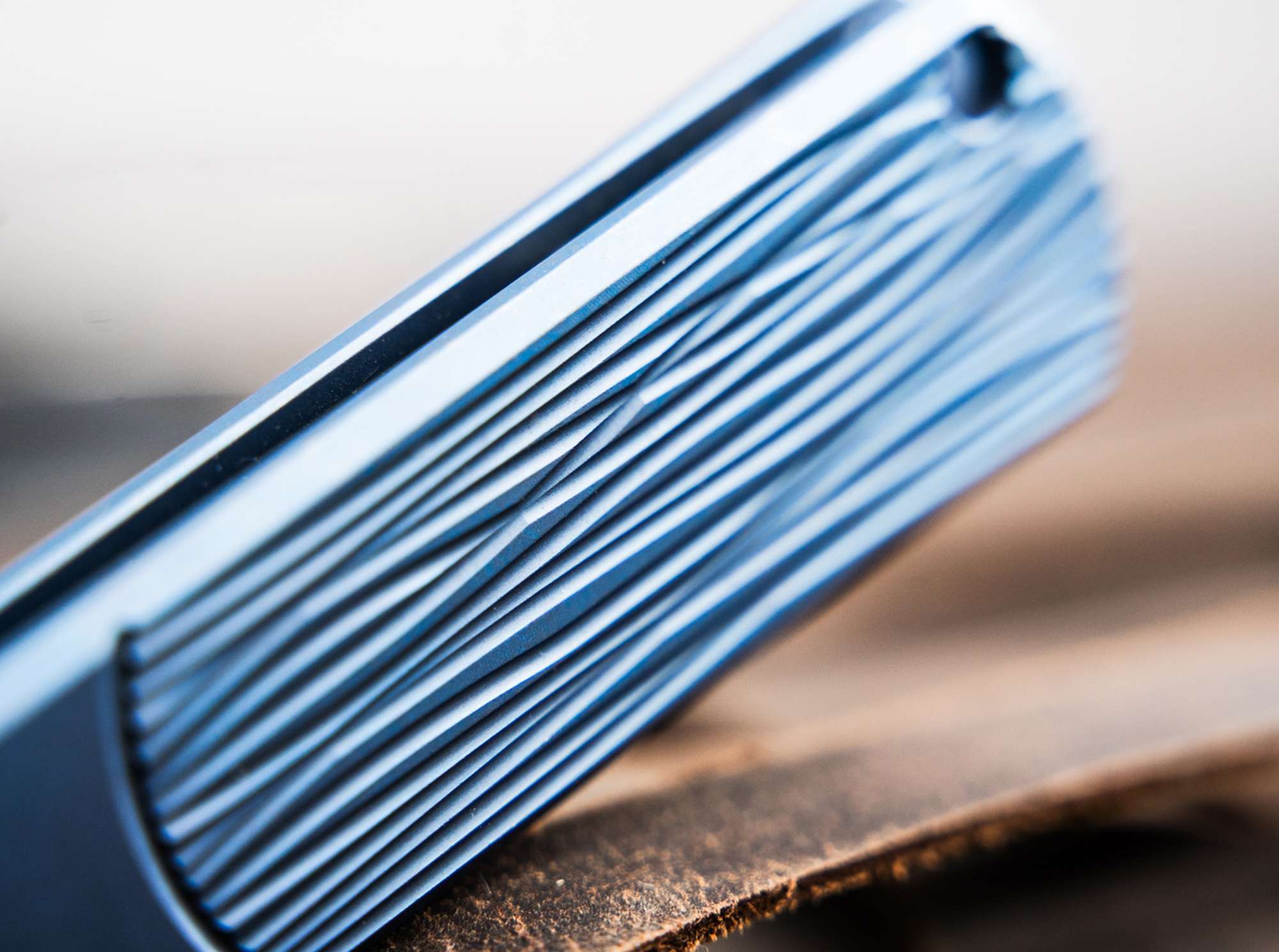 - Griff aus blau anodisiertem Titan mit Holzmaserung-Optik