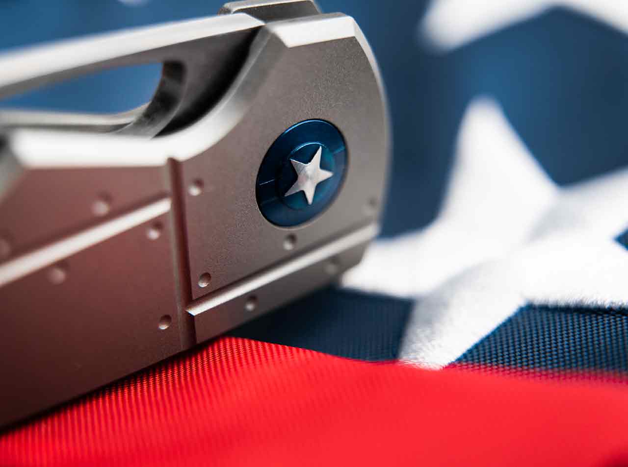Die blaue Klingenachsschraube trägt sogar den Silver Star der US Army und die rot anodisierten Schrauben erinnern an die Farbgebung des Heckruders.