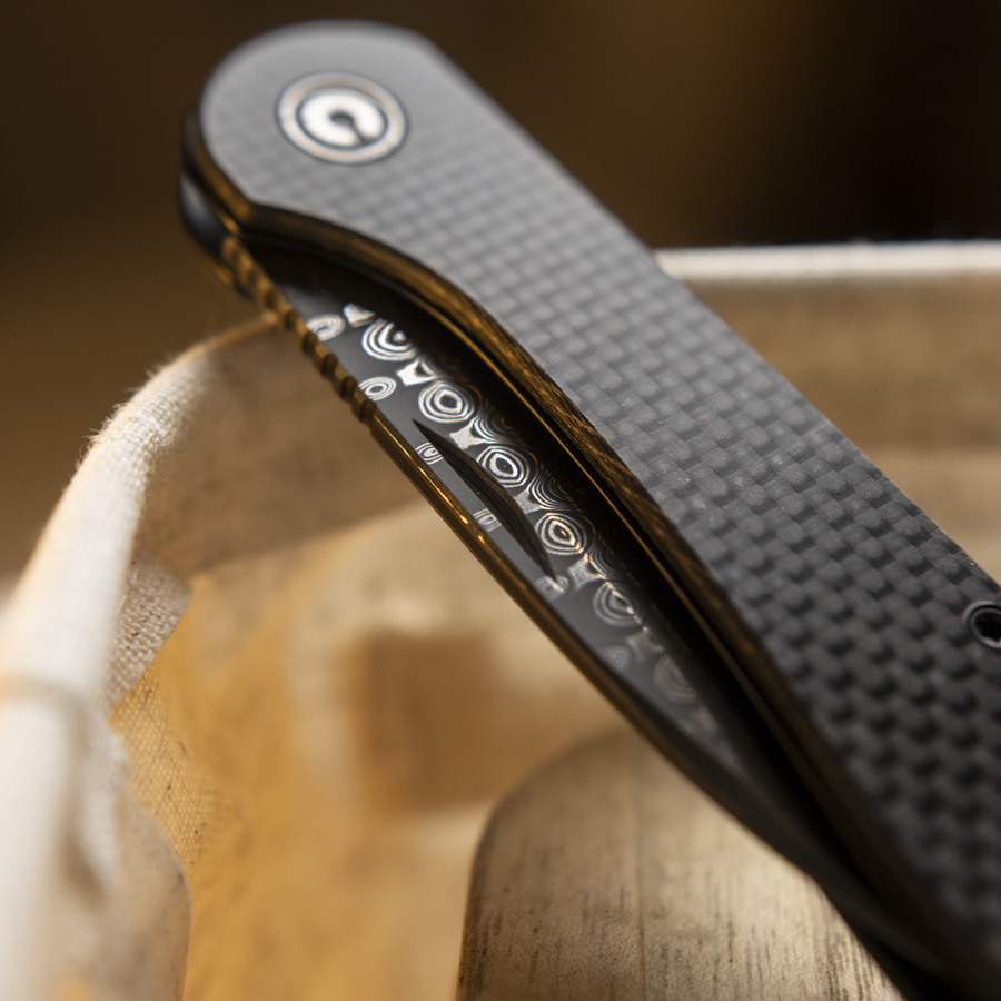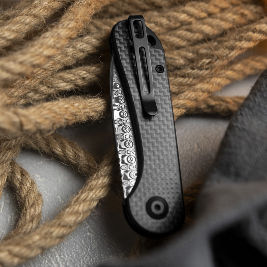 Die auf Bronzewashern gelagerte Klinge aus 14C28N-Edelstahl lässt sich sanft über den Nagelhau öffnen. Dank feinem Hohlschliff und dünner Schneidfase ist das Elementum ein echter Schneidteufel. Die elegante Swedge verleiht der Klinge einen sportlichen, aber dezenten Look. Auch beim Klingenfinish hast du die Wahl: Satin, Black Stonewash oder eine edle Damast-Klinge – passend zu deinem EDC-Stil.