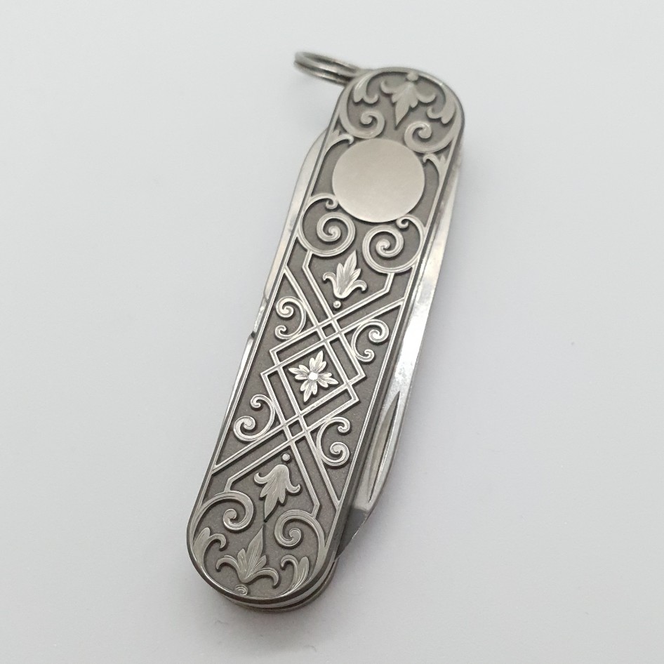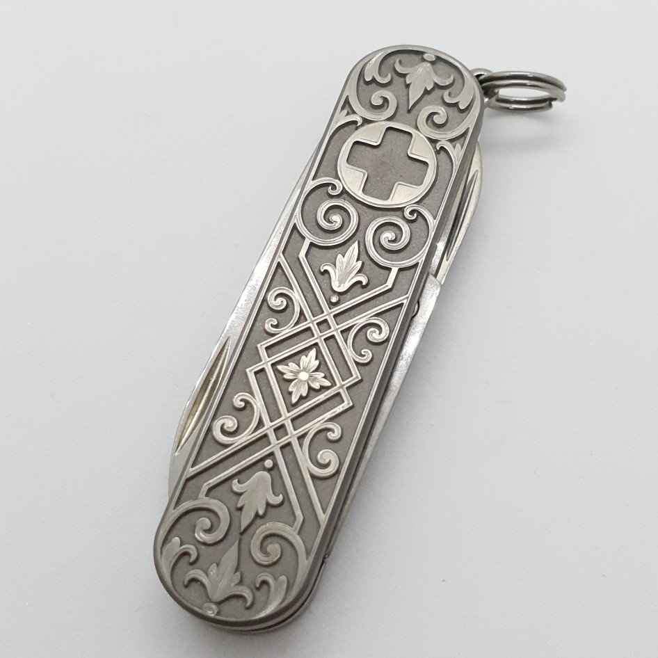 Fond Creux Gravur auf Vorder- und Rückseite für kleine schweizer Taschenmesser mit einer Schalenlänge von 58 mm.