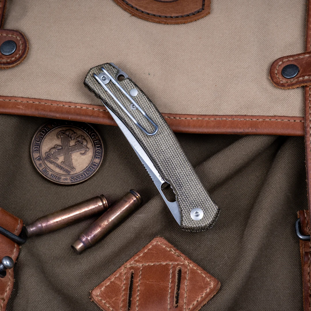 Der reversible Drahtclip sorgt dafür, dass du das Messer ganz nach Belieben tragen kannst. Der Backspacer aus Titan oder Messing setzt einen markanten Akzent, der das Design perfekt abrundet.