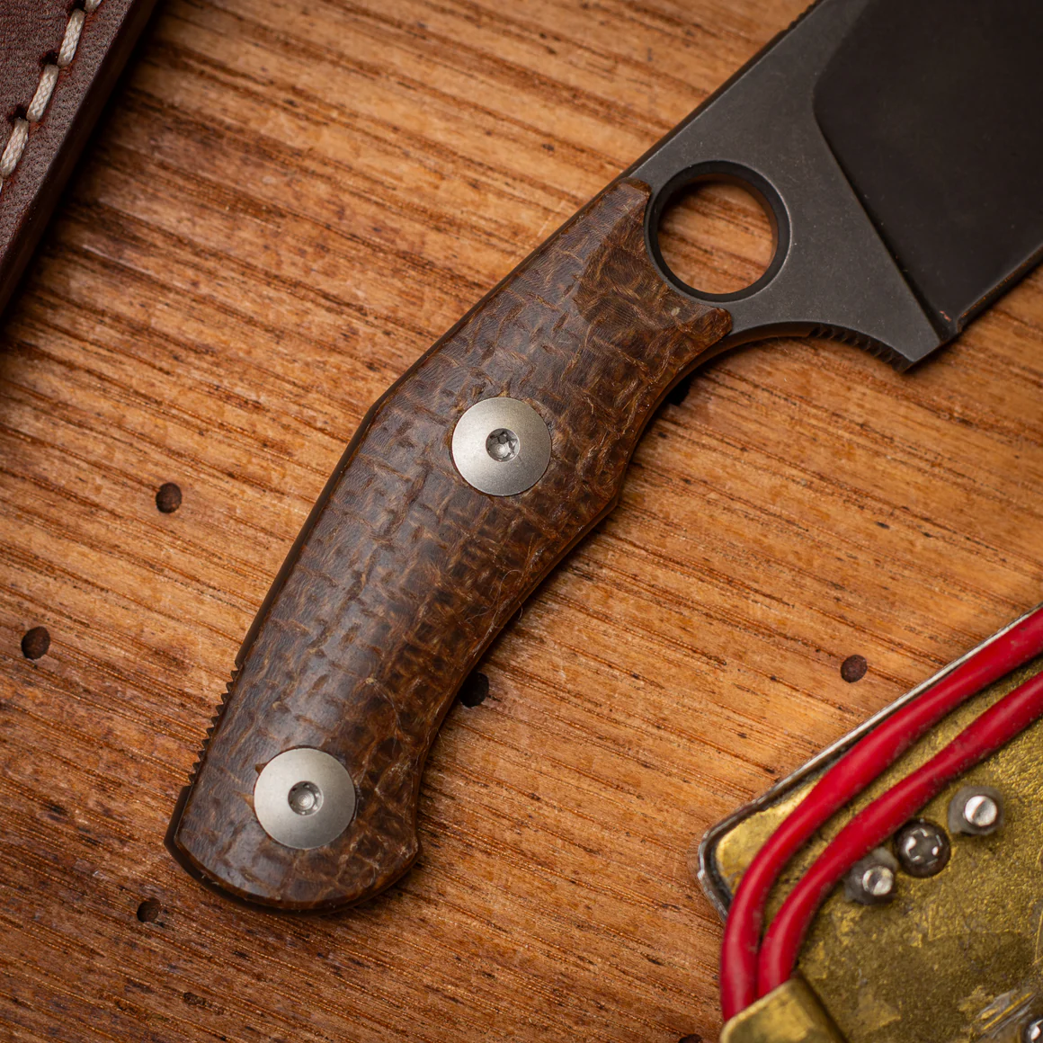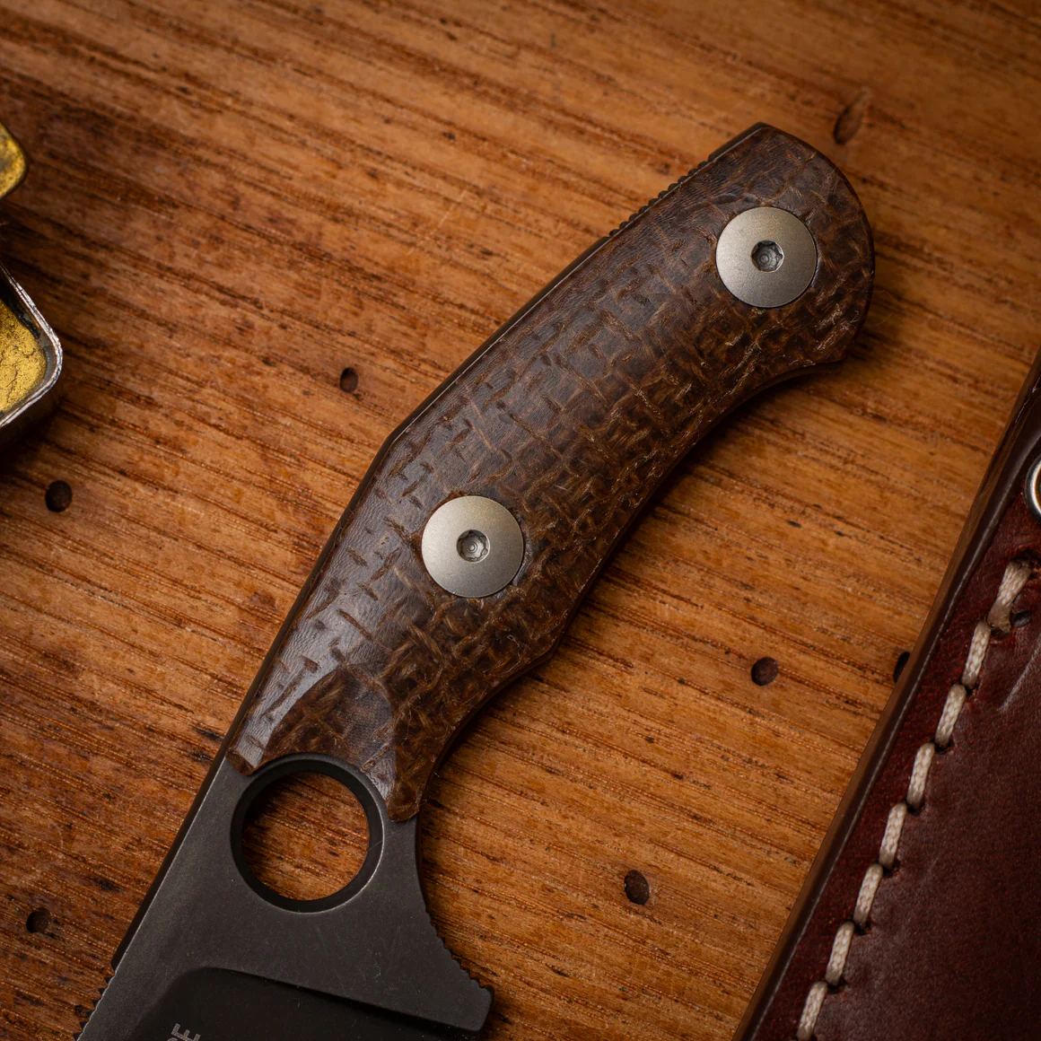 Beim Material hast du die Wahl: Green Micarta für einen klassischen, unaufgeregten Look; Burlap Micarta mit grober Jutestruktur und markanter Optik; oder Titan mit diagonalem Fräsmuster, das gleichzeitig griffig und überraschend smooth ist. Jede Variante bringt ihren eigenen Charakter mit, ohne dem Messer seine klare Linie zu nehmen.
