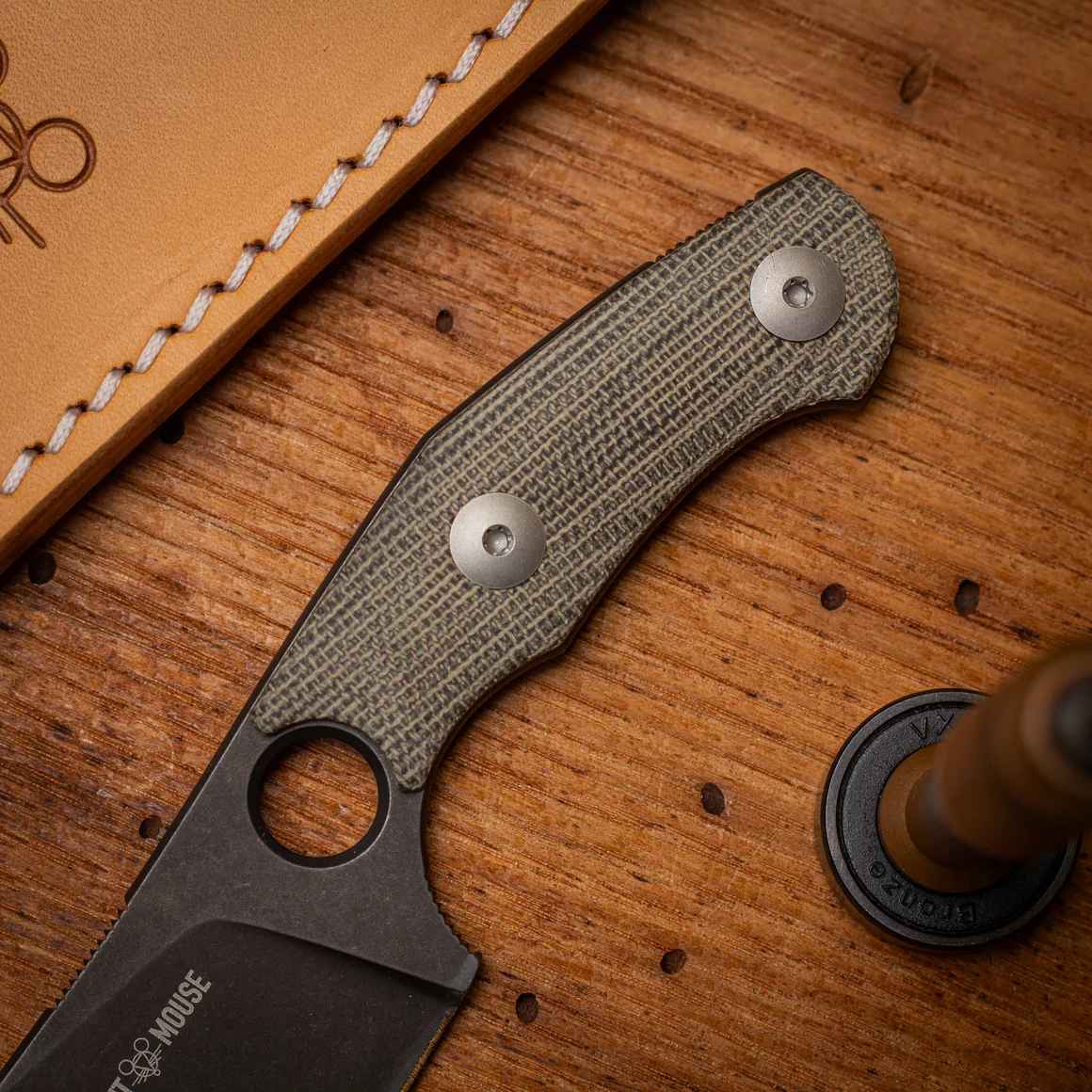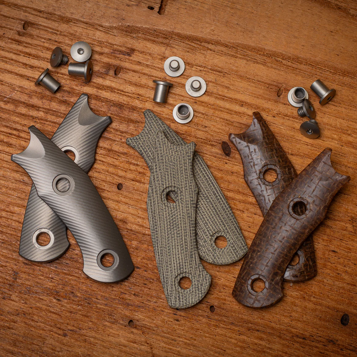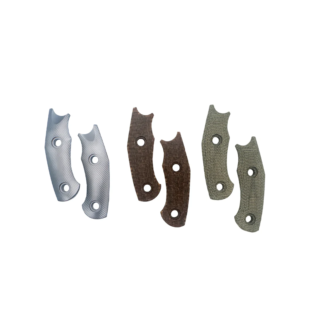 Beim Material hast du die Wahl: Green Micarta für einen klassischen, unaufgeregten Look; Burlap Micarta mit grober Jutestruktur und markanter Optik; oder Titan mit diagonalem Fräsmuster, das gleichzeitig griffig und überraschend smooth ist. Jede Variante bringt ihren eigenen Charakter mit, ohne dem Messer seine klare Linie zu nehmen.