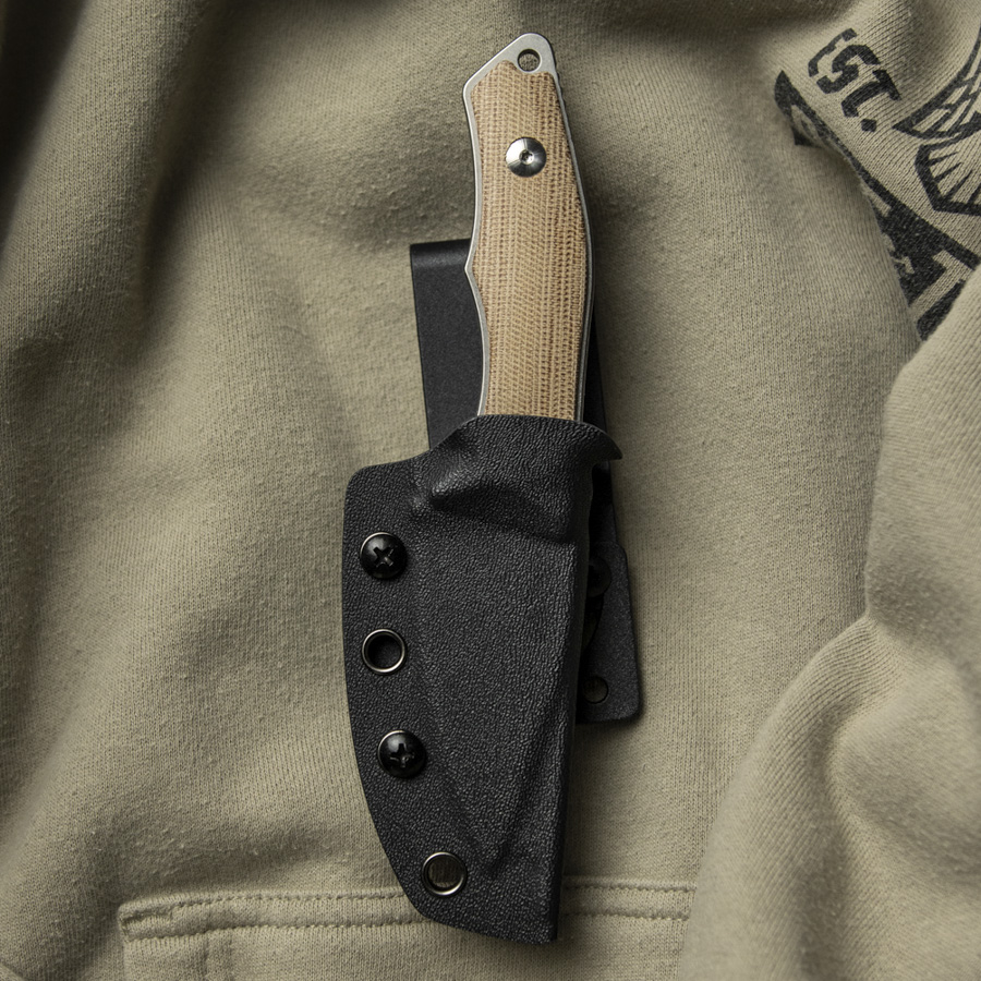 - Kompaktes Fixed mit Kydexscheide und Gürteladapter für eine horizontale als auch vertikale Trageweise