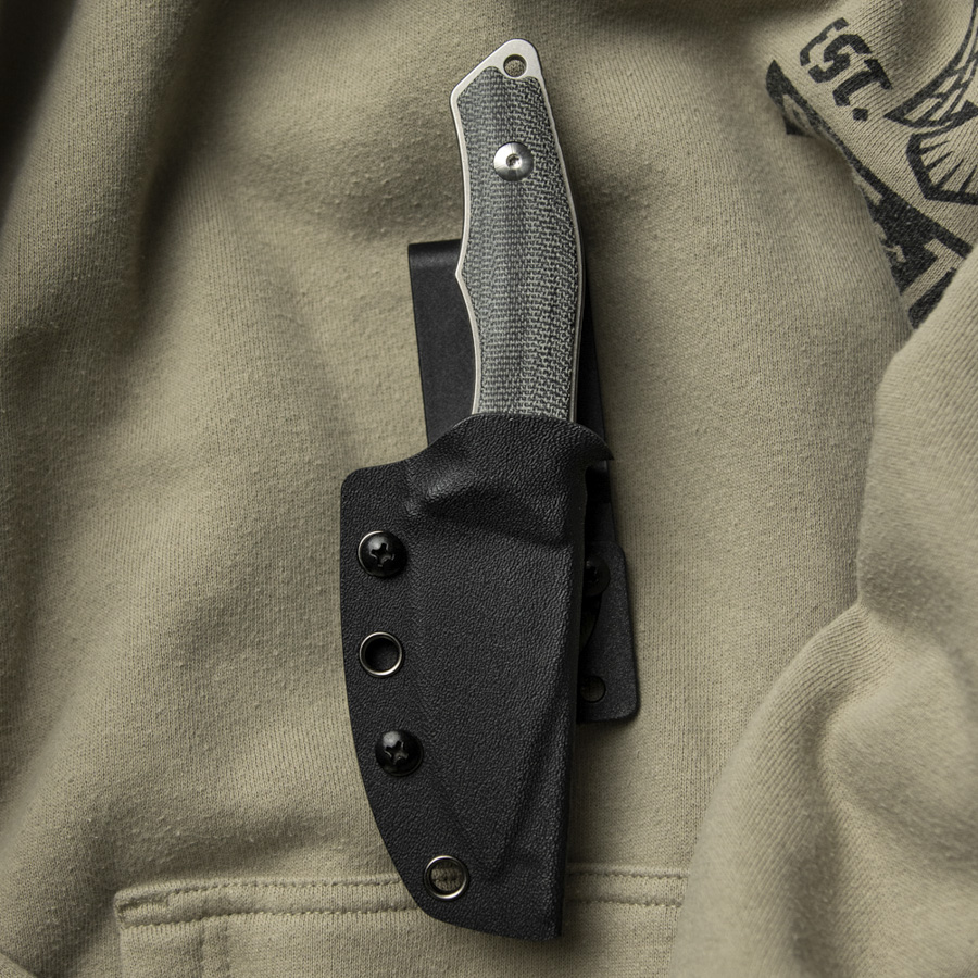 - Kompaktes Fixed mit Kydexscheide und Gürteladapter für eine horizontale als auch vertikale Trageweise