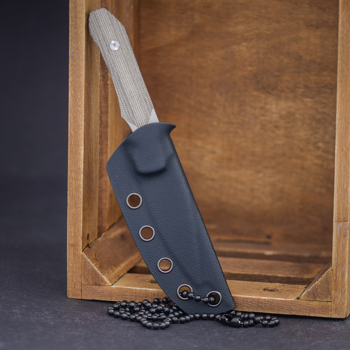 Die passgenaue Kydex-Scheide sitzt satt und sicher. Im Lieferumfang enthalten sind eine Kugelkette sowie ein cleverer Beltadapter, der dir erlaubt, das Messer quer oder senkrecht zu tragen – oder einfach minimalistisch in der Hosentasche oder deiner Lieblings-EDC-Pouch zu verstauen.