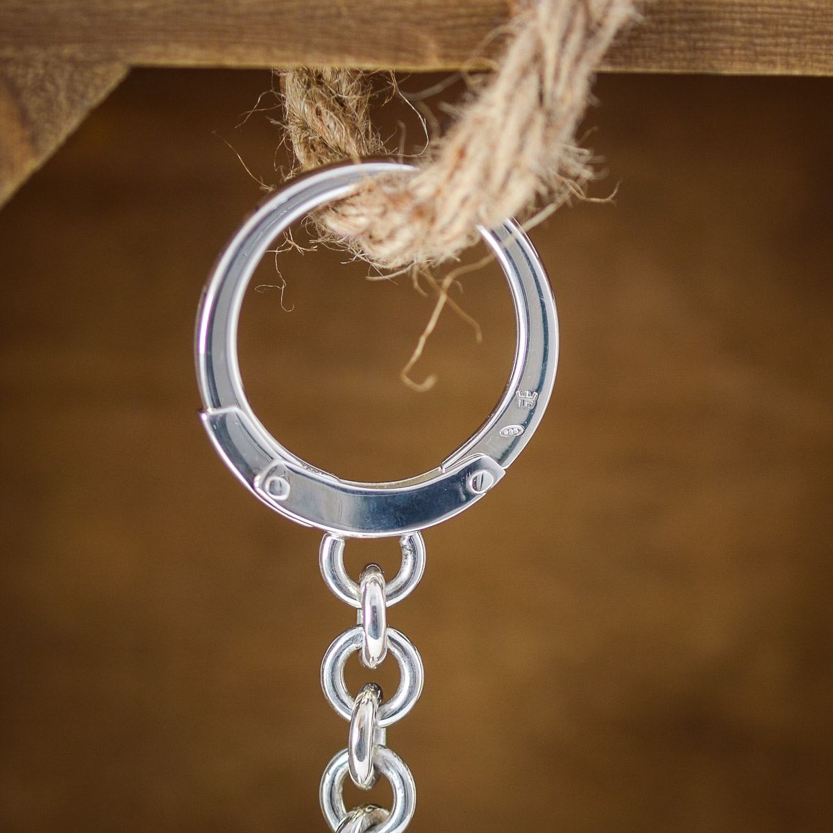 Der Ring öffnet über einen präzisen Hebelverschluss: komfortabel, sicher und ohne das Material zu verbiegen. Gefertigt in Deutschland, überwiegend in Handarbeit – ein zeitloser Begleiter, der täglich Freude macht.