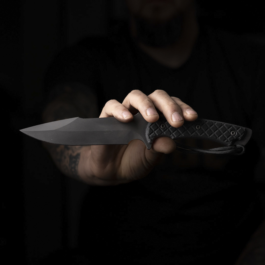 - Version Black: Klinge PVD beschichtet Schwarz, Griffschalen aus schwarzem Micarta, Kydex schwarz
