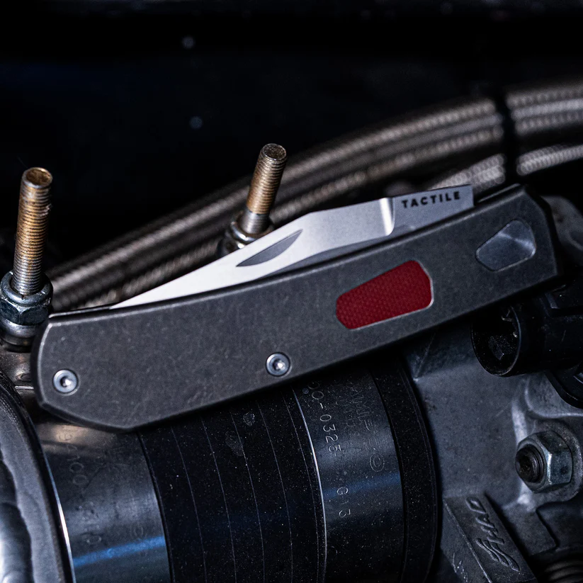 - Griff aus Titan mit rotem G10-Einsatz in Schildform