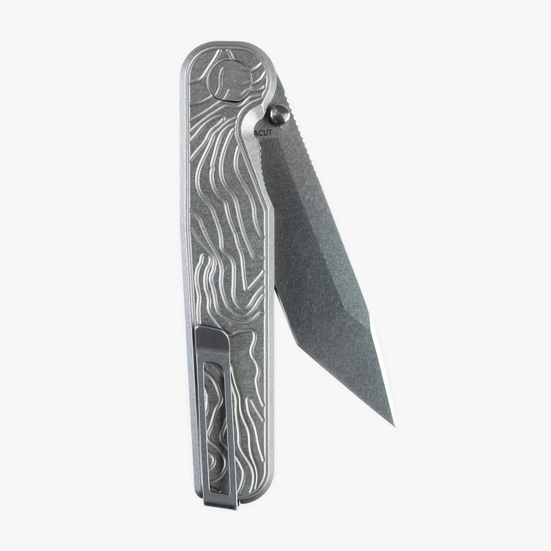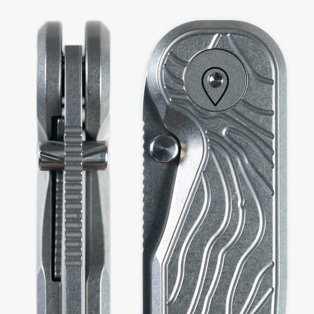 - Griff aus Titan mit eingefrästem topografischen Muster (aus der Nähe der Tactile Knife Werkstatt in Texas)