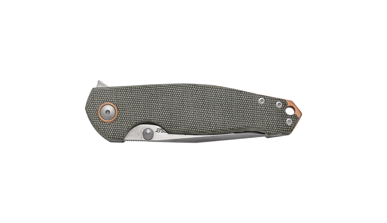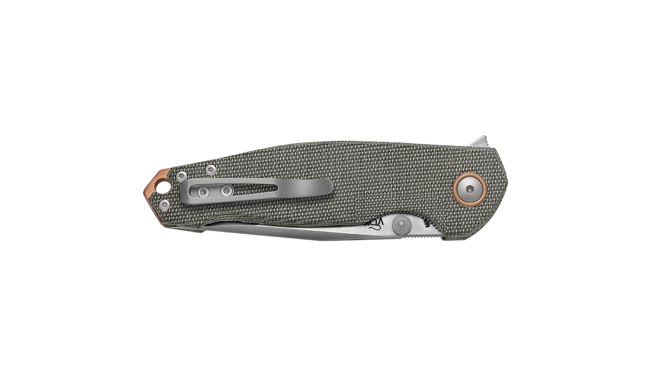 Der Griff ist mit Griffschalen aus Micarta versehen. Unter den Schalen liegend befinden sich Liner aus Stahl, die zudem auch für den Liner-Lock-Verschluss sorgen. Dieser verriegelt das Messer sauber im geöffneten Zustand und lässt sich natürlich problemlos einhändig bedienen. Geöffnet wird die auf Kugellagern laufende Klinge über den kleinen Flippertab, der über das Heft hinausragt oder über die beiden Daumenpins.